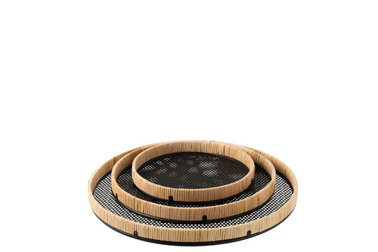 Set Of 3 Trays Round Metal/Rattan Black/Natural